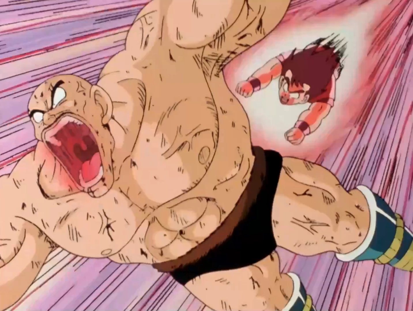 Nappa deja malherido a Krilín y luego va a matar a Son Gohan. Nappa se enfada y tiene pensado matar a Gohan , pero Piccolo se sacrifica para salvarlo. Ahora Piccolo ya no es malo. Son Gohan le ha cambiado el corazón. Son Gohan quiere vengar a Piccolo y saca una extraordinaria fuerza pero no le sirve. Cuando Nappa va a matarlo aparece la nube Kinton y le salva. ¡¡¡¡Goku ha llegado!!!!.
